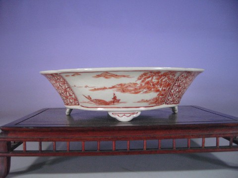 60.赤蛸唐草紋五彩山水図外縁隅入正方鉢
