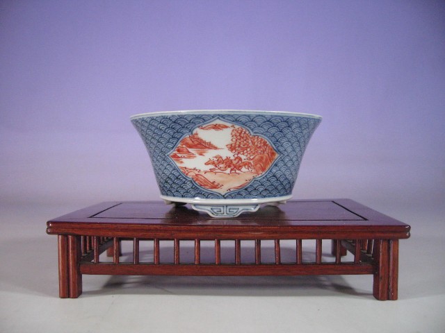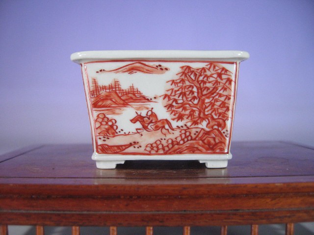 60.赤蛸唐草紋五彩山水図外縁隅入正方鉢