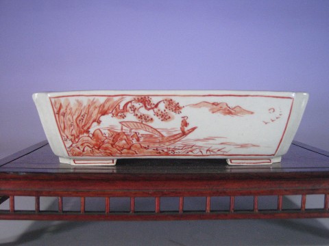 60.赤蛸唐草紋五彩山水図外縁隅入正方鉢