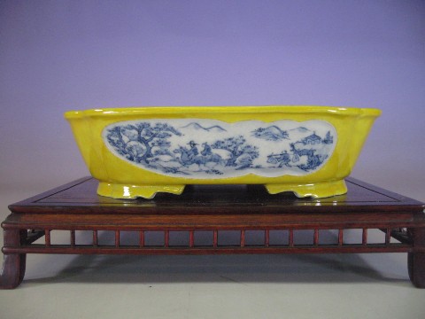 60.赤蛸唐草紋五彩山水図外縁隅入正方鉢