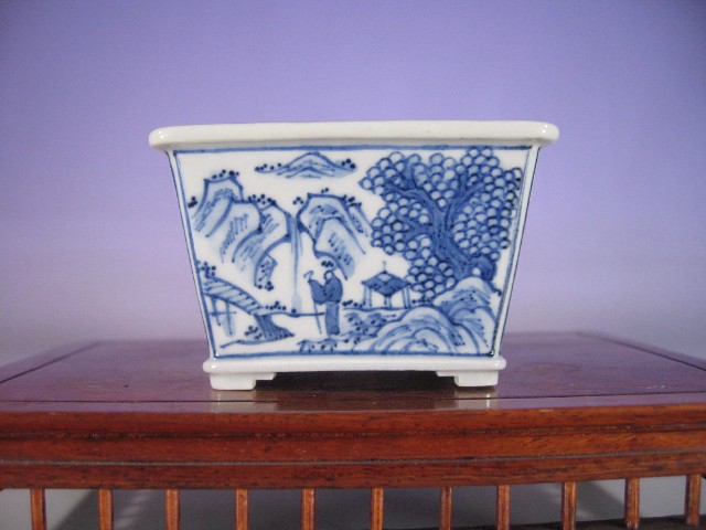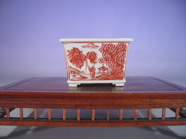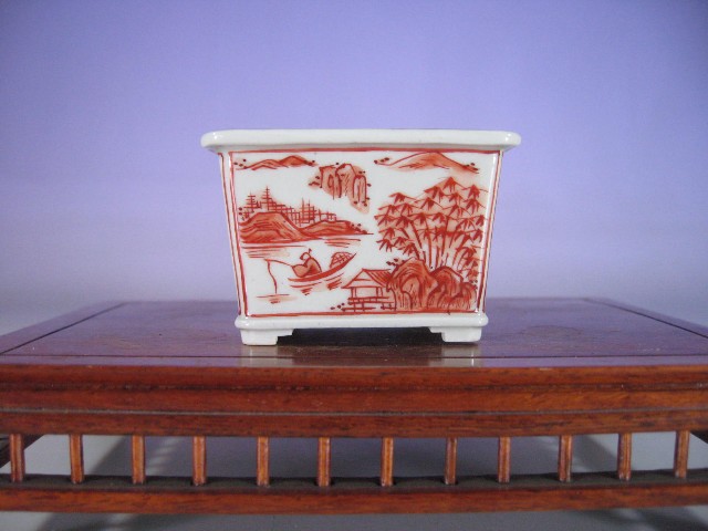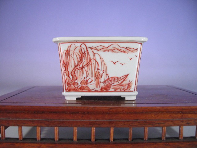 60.赤蛸唐草紋五彩山水図外縁隅入正方鉢