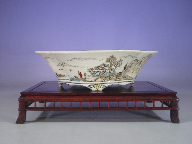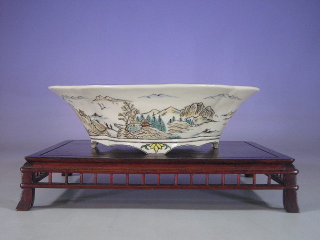 60.赤蛸唐草紋五彩山水図外縁隅入正方鉢