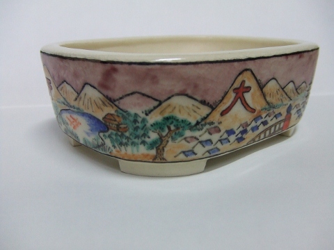 40.桃花釉五彩山水図モッコウ