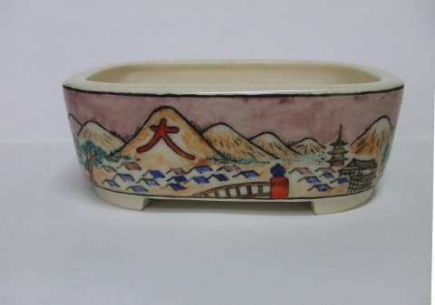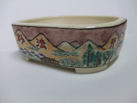 32.の桃花釉赤絵山水図モッコウ鉢